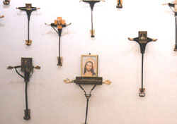 With his not unreasonable disdain for televangelists, he was unable to separate the message of Jesus in Scripture with the charlatans who profited from his name. His last work was a large wall installation 76 J.C.’s Led the Big Charade (1994), which consists of “76 crucifixes whose bases are made from the rusted metal handles of toy wagons. Glued atop the crucifixes are kitsch prints of Jesus, ranging in mood from anguished suffering to smarmy cuteness.” Art in America, June 1995.