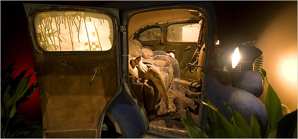 . . . in Hope, Idaho, was the artist’s ultimate act of staged outrage. As a tape deck played a loop of Glenn Miller hits, a 1940 Packard was driven by the artist’s wife and collaborator, Nancy Reddin Kienholz, down a ramp and into a freshly dug grave. Kienholz’s body was seated in the passenger seat of the Packard, which was buried with him.